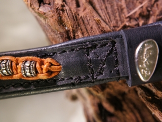 De halsband is gevlochten met drie cognac kleurige lederen veters, die voorzien zijn van kralen en bevestigd zijn op een zachte zwart rundlederen leerstrook